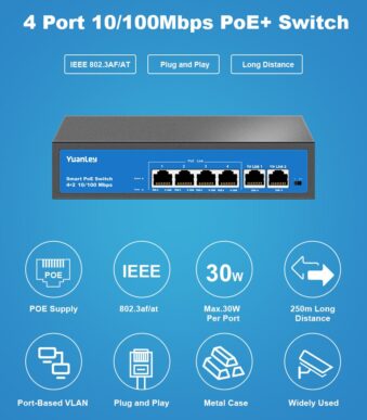 Il prezzo originale era: 139,99€.129,99€Il prezzo attuale è: 129,99€.4 Port PoE Switch, 2 Port Uplink, Power Over Ethernet 802.3af/at 78W, Unmanaged Metal Smart Desktop Network Switch